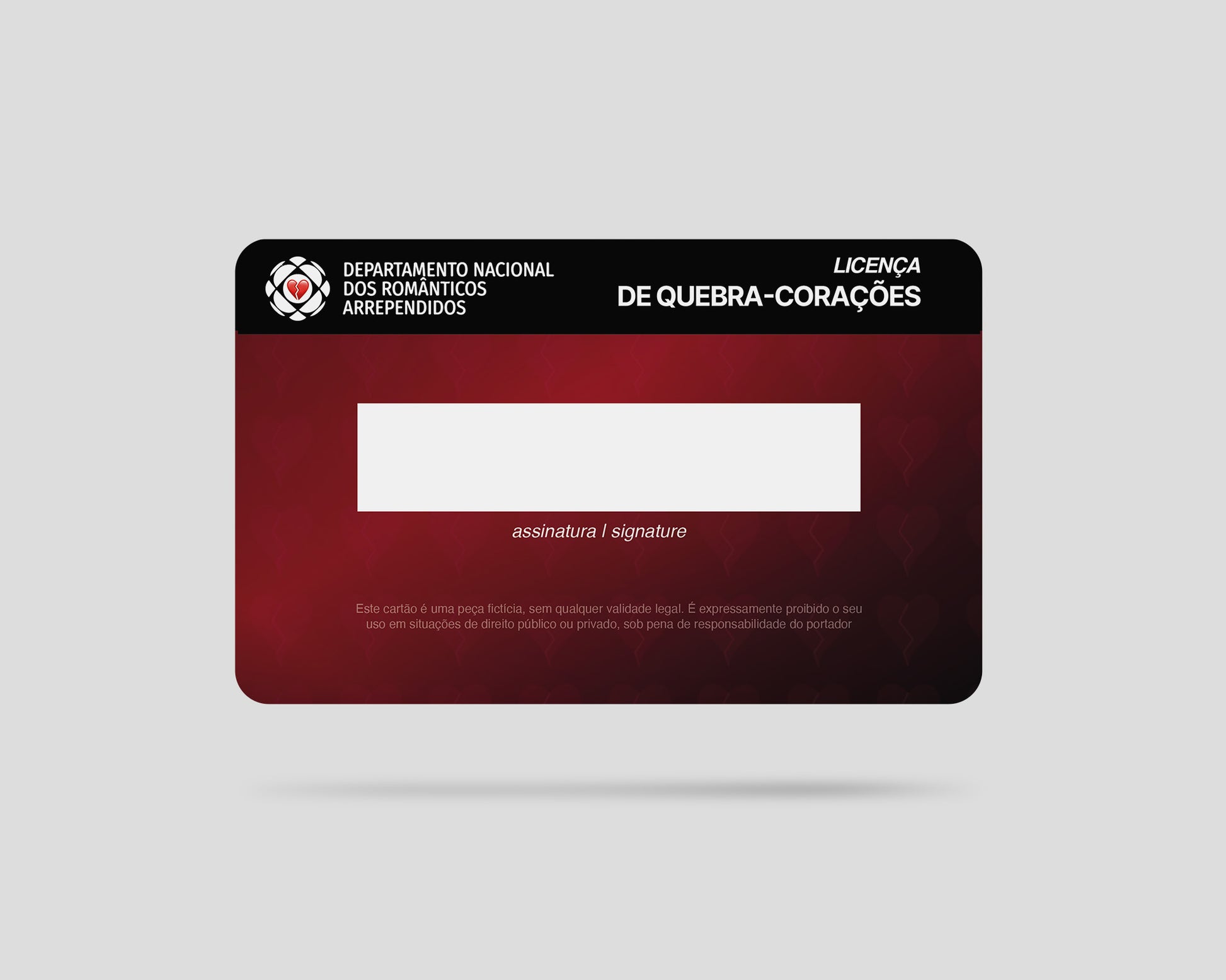 Você está procurando uma Licença de Quebra-Corações falsa de fantasia? A Loco Cards oferece a Licença de Quebra-Corações fictícia, totalmente personalizada e criada exclusivamente para uso recreativo, criativo e cenográfico.